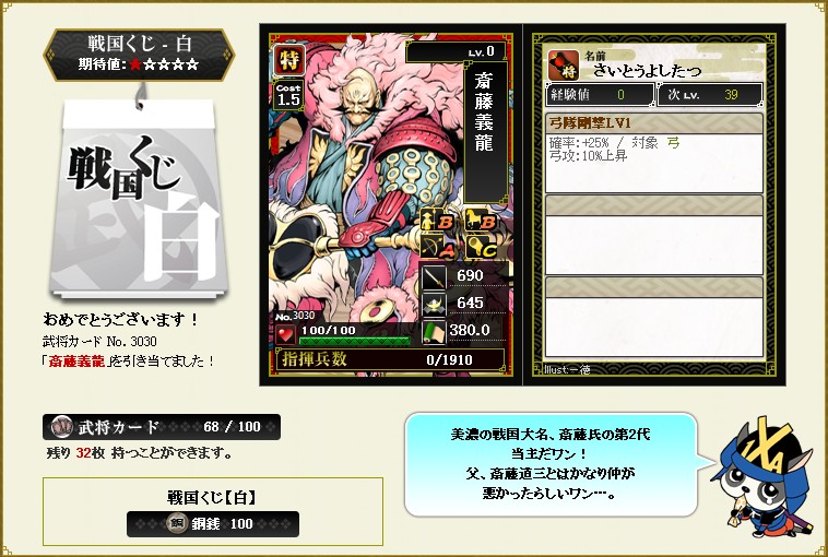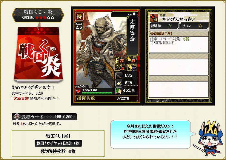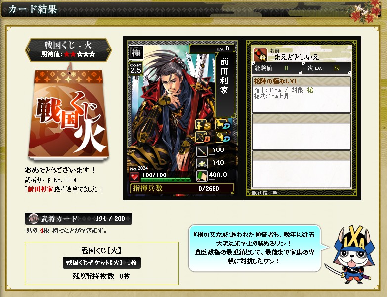 前回の祭くじは残念ながら上3枚でしたが 今回は長束さんがきてくれまし コスト、適性、兵数ともなかなか優秀 スキルは残念ですが 防御用に何枚か欲しいですね 1枚はランクアップして・・・ これを引くまで、この武将のことはまったく知りませんでした・・・ 今回はこの点もラッキーだったかな |