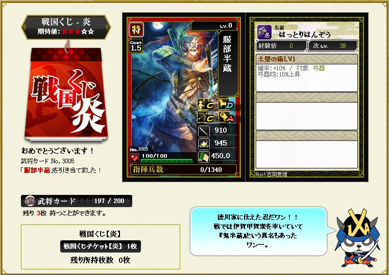 今回も攻撃Pだけ炎チケげっとでして 百地さんが来てくれました・・・2枚目 この百地さんは、忍属性ってことで忍同士で組むと部隊スキル効果が付きます まずは迅速合成で陣張り要員にするつもりです が、銅銭不足でいつになるか・・・ |