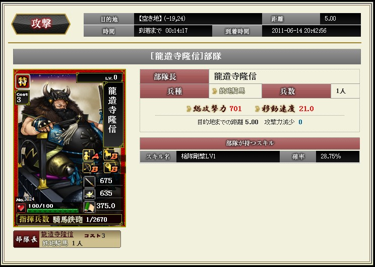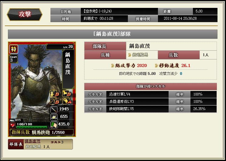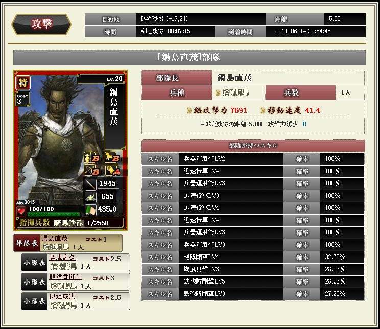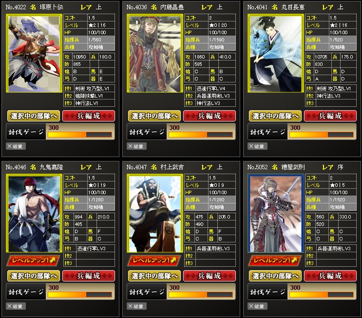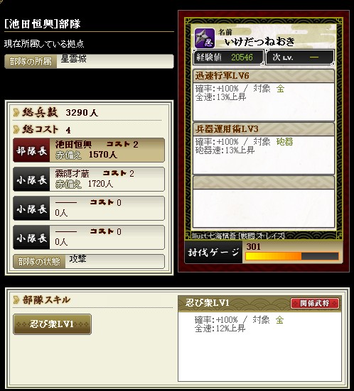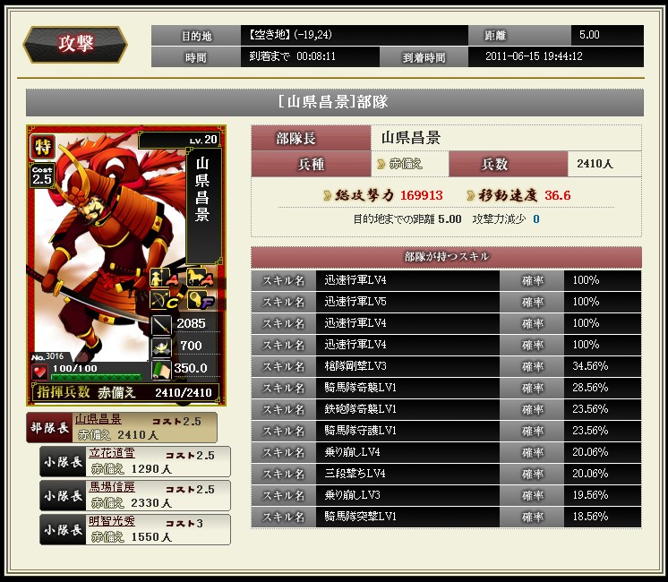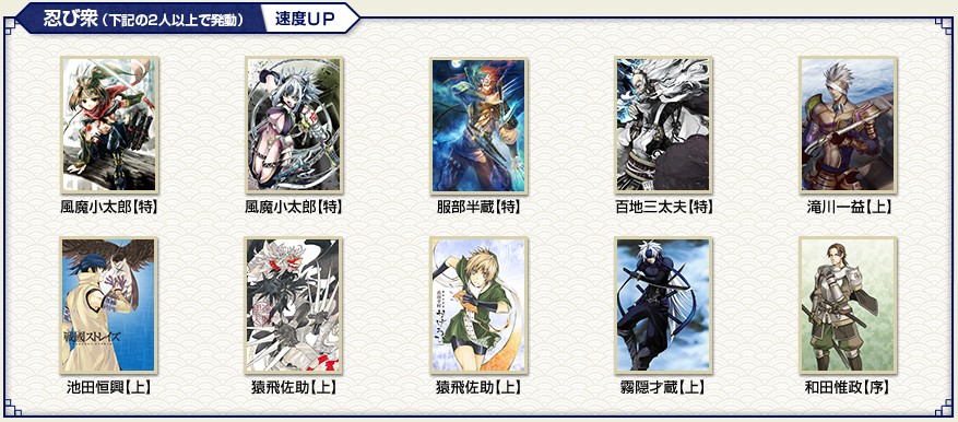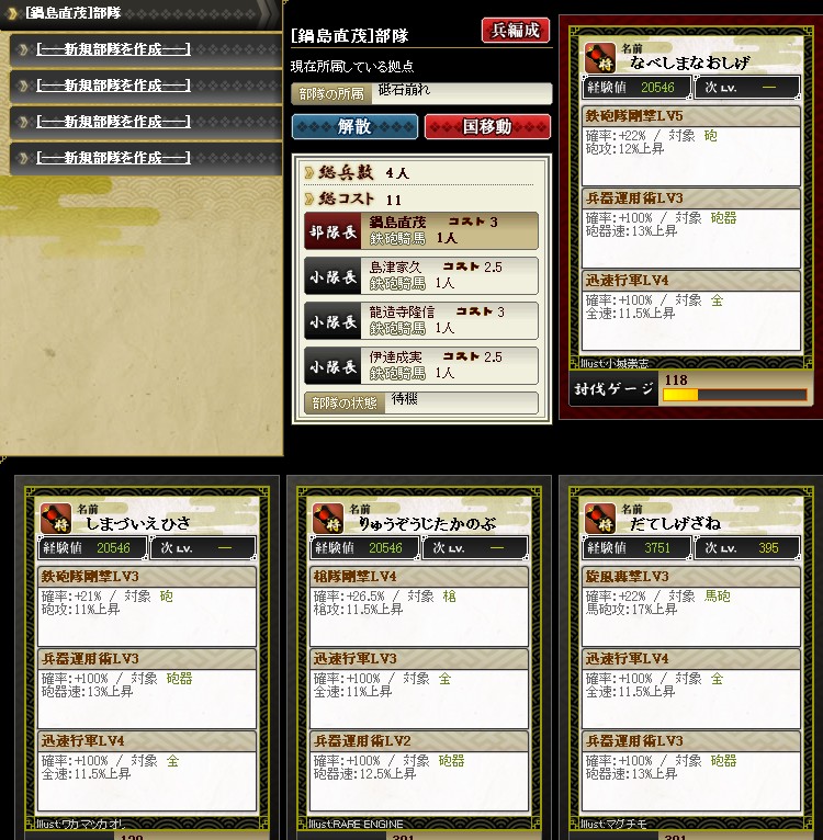 先日のアプデで部隊スキルが追加されました ようやく忍属性に光があたったようです 陣張り用に部隊を組んでみました お供に霧隠才蔵をいれるとこんな感じ 全速12%は迅速LV5相当になります これで陣張りの時間短縮にもなるし だいぶ楽になりますね |