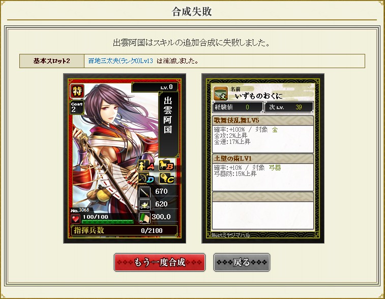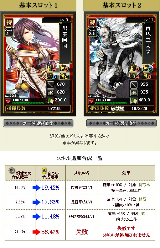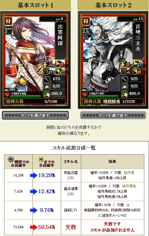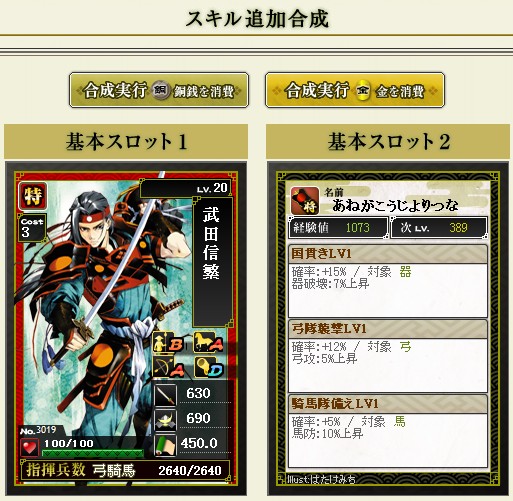 旧笹切掲示板で紹介されていた 姉小路を使った迅速合成を試してみました 姉小路に捨てスキル2つ付けるとこんな感じ になります あとは成功させるだけです 捨てスキルなくても姉小路×2合成ではこんな感じ うまいこと付いてくれました 姉小路合成を繰り返すとこんなのもできます 噂の謀殺・・・ このカードどうしたもんでしょうか |