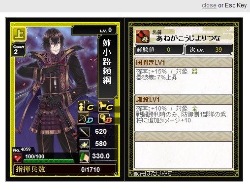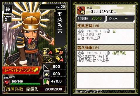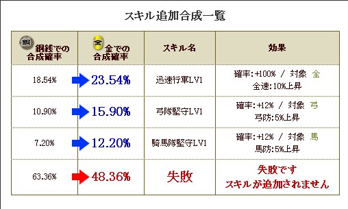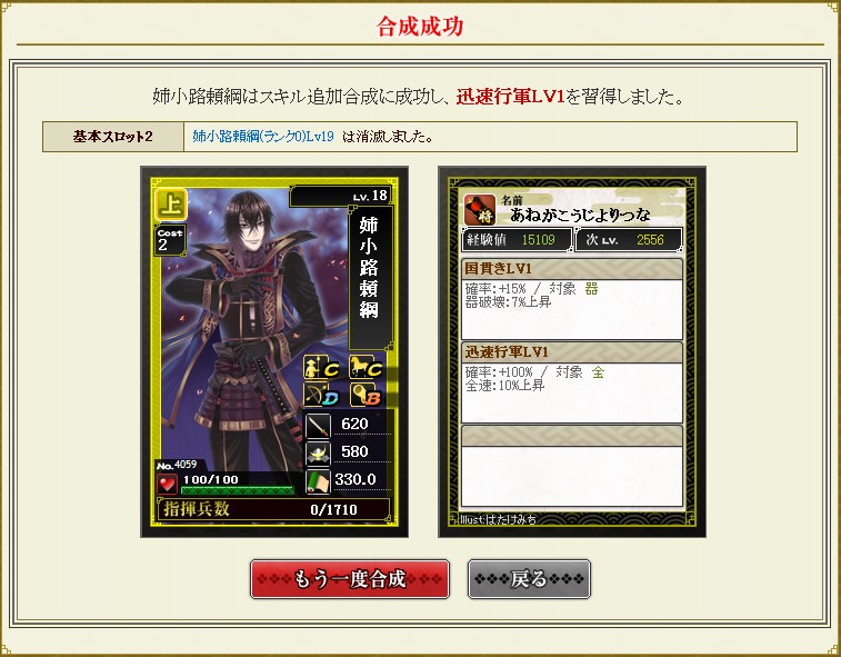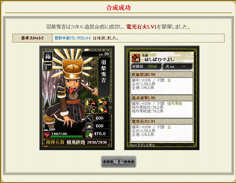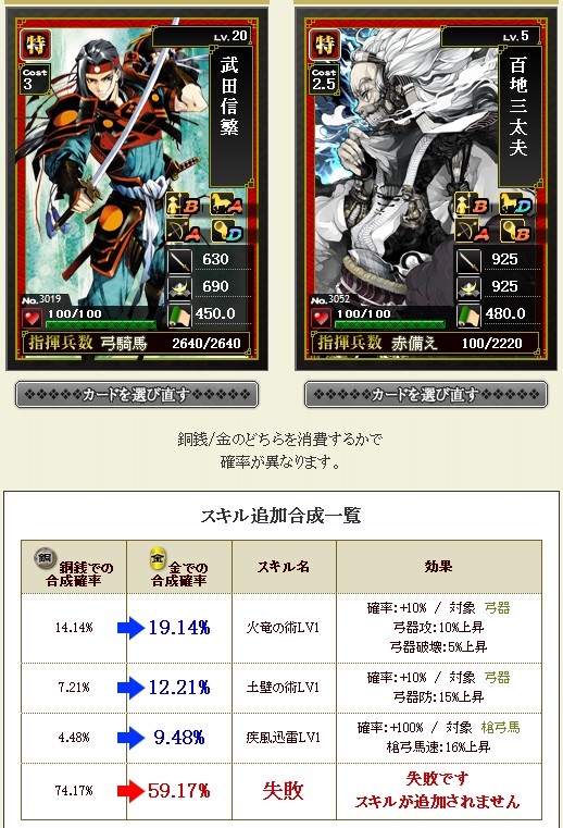 先日の百地さんを合成をすると疾風迅雷が出るのを見て 少し調べてみました なんでも、槍衾を付ければ義兵に疾風が候補に出るそうな で、早速手持ちの清水を合成したら・・・ 残念ながら槍剛撃・・・ そう簡単にいかないよね 疾風迅雷が1つ繰り上がって足軽軍法が登場 また清水を手に入れて合成しようと思ってます 安い百地さんをみかけたら購入しとくのも悪くないですね |