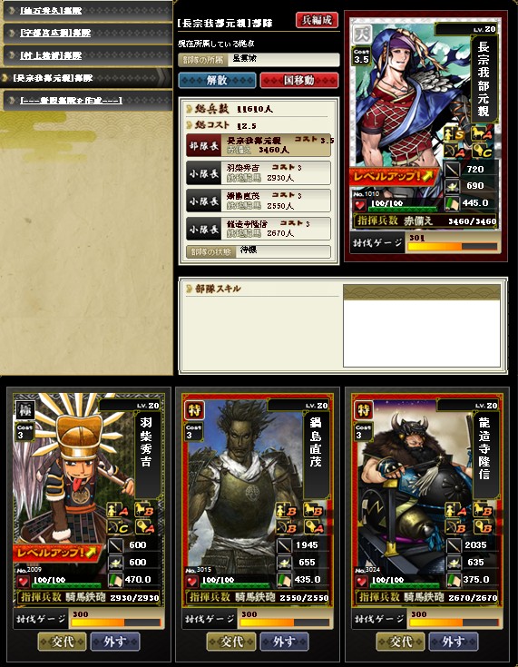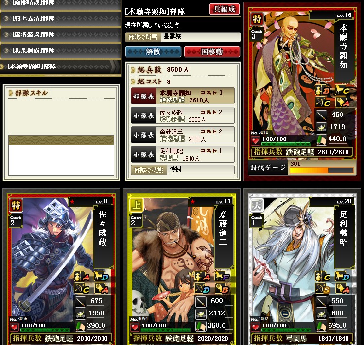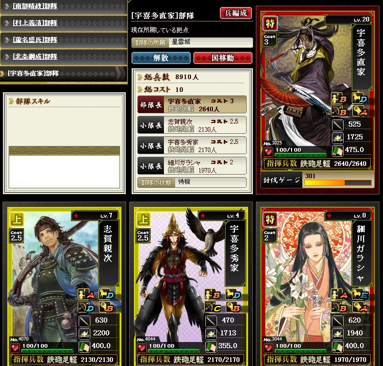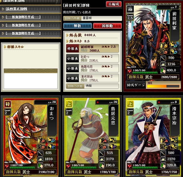 こんばんは 今回は防御部隊の紹介です まず最初は鉄砲隊からってことで、以下の編成を良く使っています この部隊でコスト8 この編成は1例でして 他の砲防カード、特宇喜多、特ガラシャ、上宇喜多、上志賀などでも いいですね 部隊組み換え要員として必要となります 他にもありますが、だいたいこんなところでしょうか こうしてみると、ベタな布陣ですね ではまた |