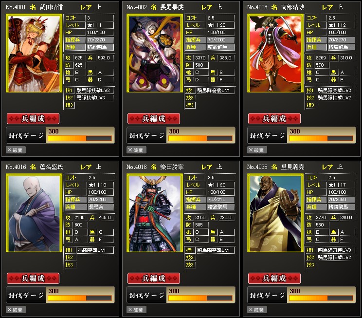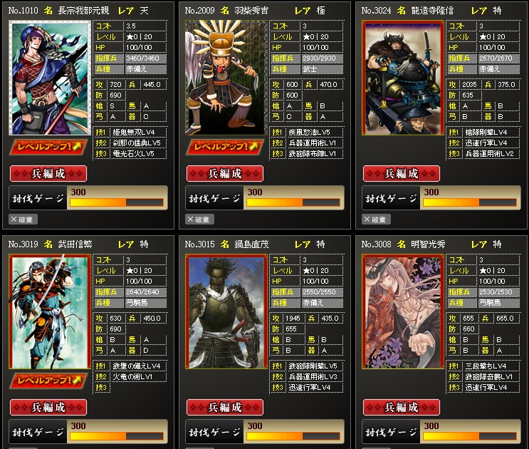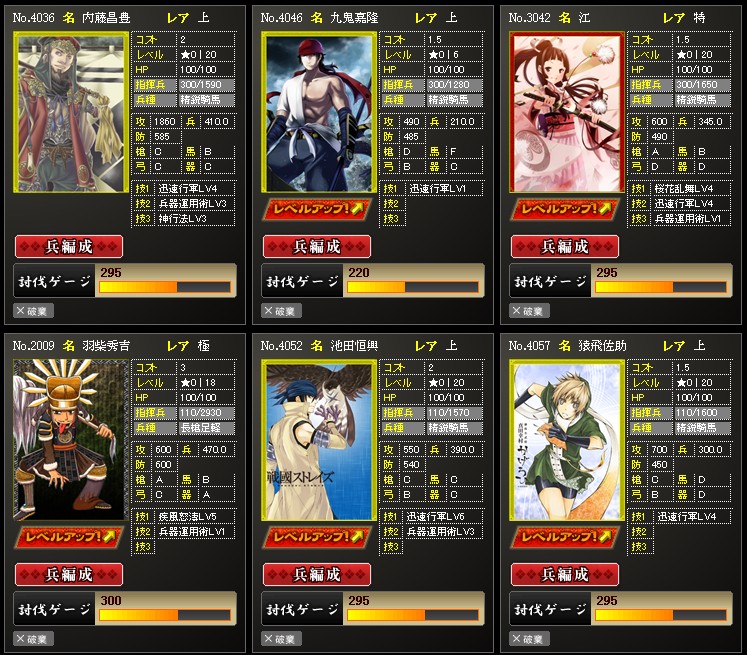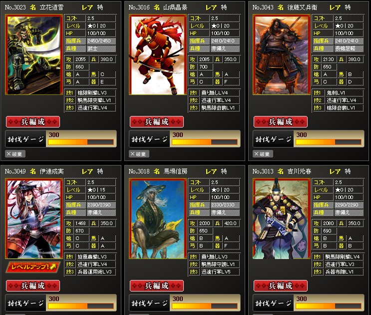 こちらは攻撃武将達です 上武将でもランクアップさせれはそれなりに使えるんだよね 育てるのも簡単なので何枚か用意しておくと何かと便利です 合流攻撃が連発する場面ではデッキの組み換えなどで HPが減るので、回復までの間これら武将達を使ってい ます 他にはランクアップの生贄にも使うことが多いですね 所持枚数200枚もありますし これら武将達を育てておくのもいいかと思います |
