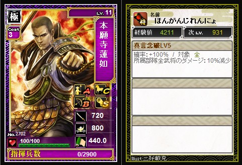 速度持ちの武将などはランクアップしてませんが 手に入れやすい武将は、ランクアップして用意しています 以下はその一部武将達です この武将達はどれも簡単に手に入れることができますので ランクアップしておくのもいいかと思います コスト2は使い勝手がいいので、この他にも用意してます そのうち☆2を用意するのもいいかなと思ってますが まだ先の話になりそうです |