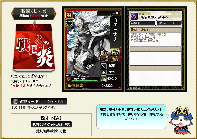 今回も攻撃Pだけ炎チケげっとでして 百地さんが来てくれました・・・2枚目 この百地さんは、忍属性ってことで忍同士で組むと部隊スキル効果が付きます まずは迅速合成で陣張り要員にするつもりです が、銅銭不足でいつになるか・・・ |