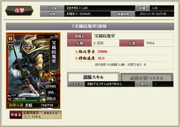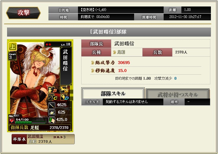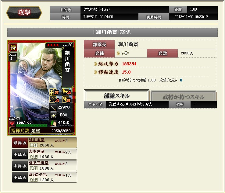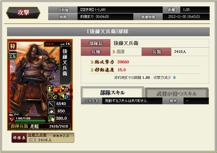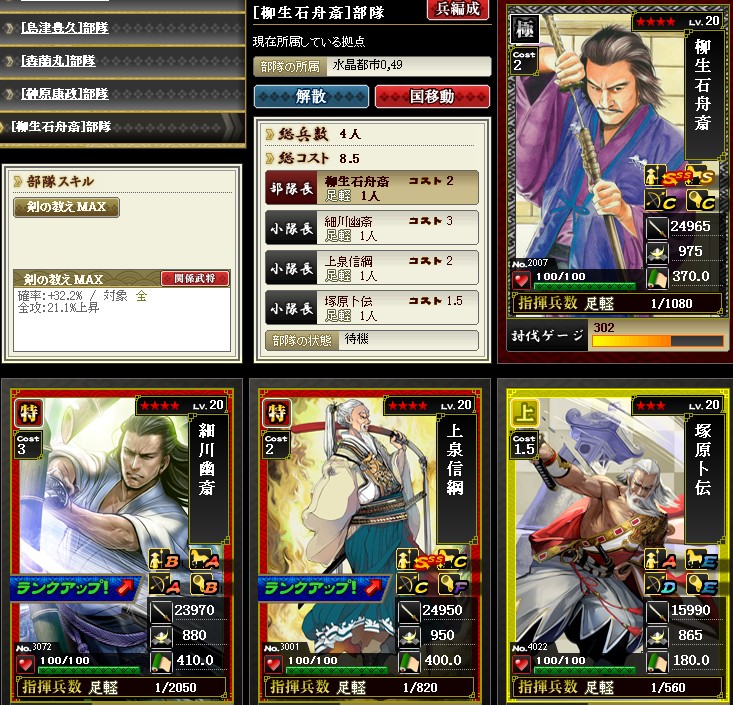 ようやく剣豪が完成しました 完成といっても今期の目標達成しただけなんだけどね なかなか合戦に参加できていないぶんコツコツと育成 していました ☆4はもう二人、かさねたんと武蔵がいます 足軽1を持たせて編成するとこんな感じの攻撃力 メンバーを替えると剣の教えMAX ただ残念なことに、剣豪単体のスキルはぜんぜん上げていません・・・ 今後の課題です |