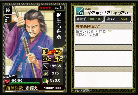かさねたんの育成が終わったので、今度は柳生先生の育成を 始めました このまま後続も育成が進めばいきなり☆8開拓できるかも・・・ 合成の生贄を購入してたら銅銭が・・・ これではマズイのでどうにかして稼がないといけません ちなみに幽斎先生はここまできています 兵数が多いので育成が楽 |
